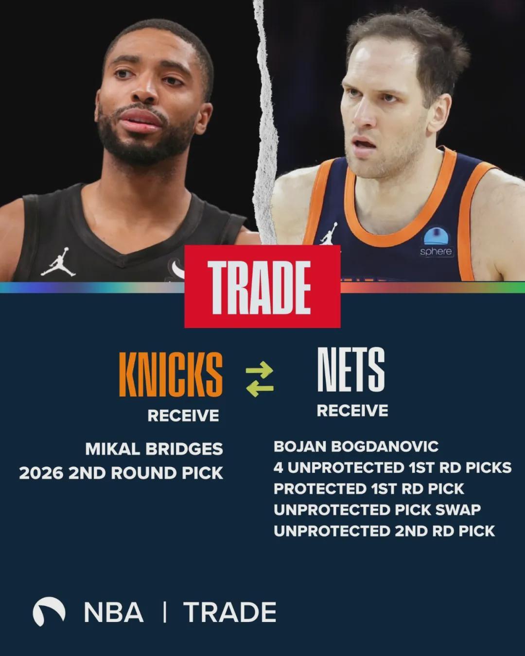 大桥的合同4年1.5亿美元,2030年夏天才能到期。合同并不算大,问题是尼克斯当初为了得到他,已经掏空未来。2024年夏天,篮网把布里奇斯和1个次轮签送到尼克斯,2换8得到博扬、5个首轮签、1个首轮互换权和1个次轮签。